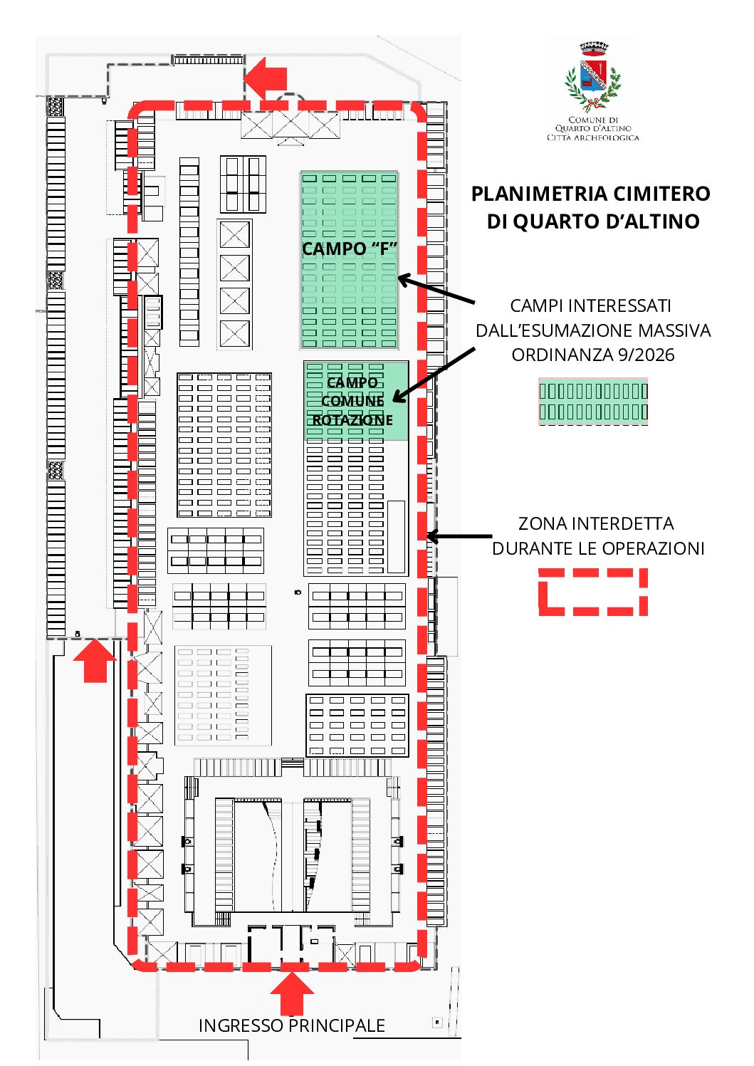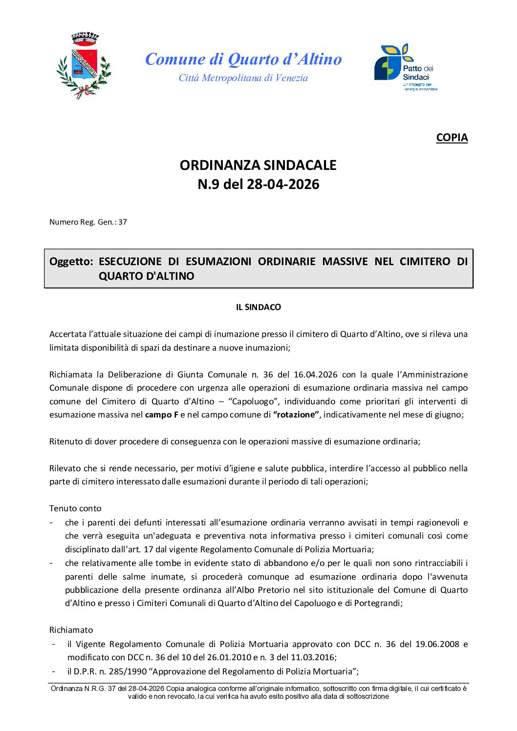 Con Ordinanza Sindacale n. 9 del 28.04.2026, è stato disposto l’avvio delle esumazioni massive ordinarie presso il Cimitero di Quarto d’Altino nel campo comune di “rotazione” e nel campo di sepoltura “F”.