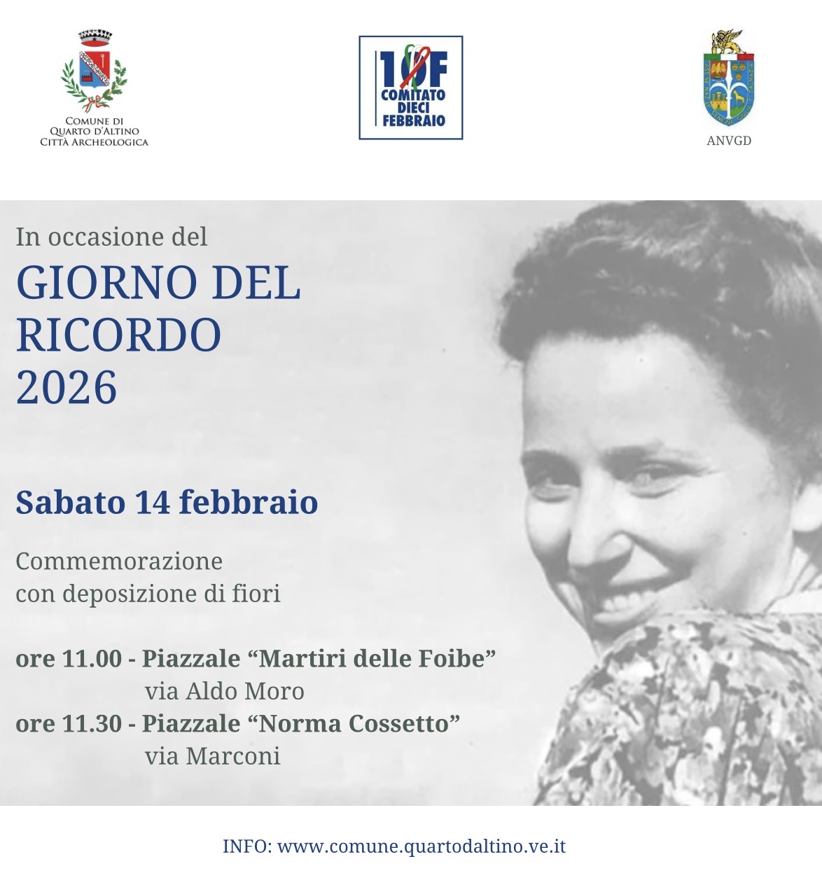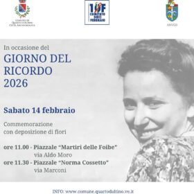L'Amministrazione comunale, in occasione del Giorno del Ricordo, per onorare la memoria delle vittime delle foibe e dell’esodo giuliano-dalmata, invita tutta la cittadinanza il giorno sabato 14 febbraio 2026 alla commemorazione con deposizione di fiori, nei seguenti orari e luoghi: