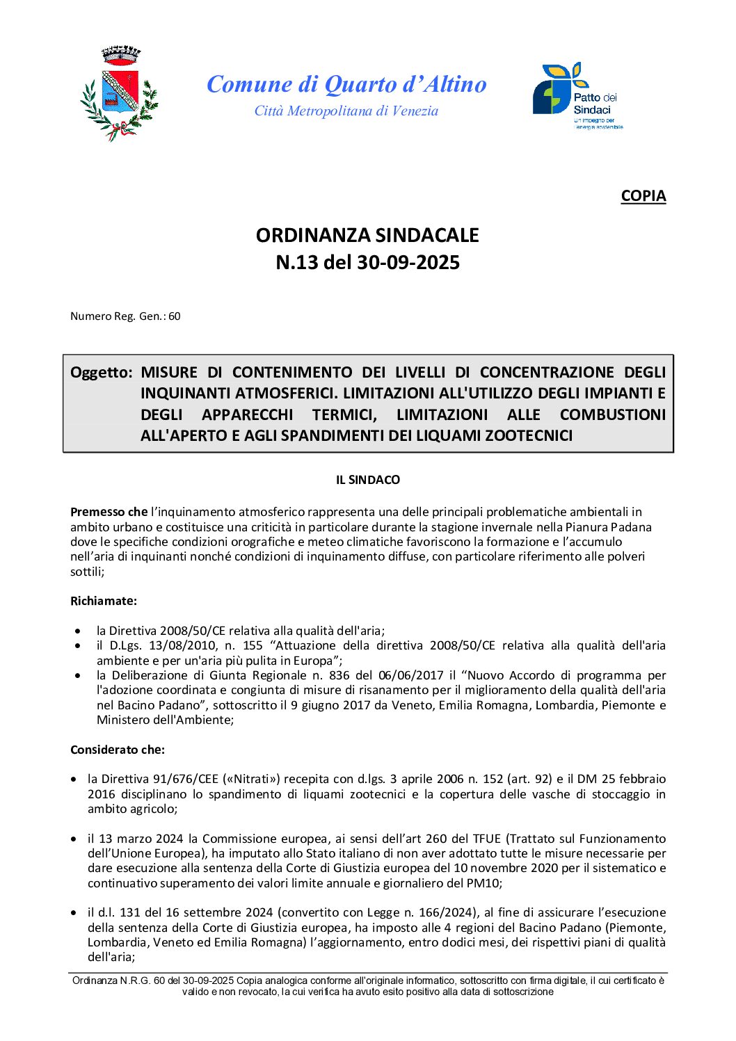 Con Ordinanza n° 13 del 30.09.2025, il Sindaco del Comune di Quarto d'Altino ha adottato una serie di misure per il miglioramento della qualità dell'aria nel periodo invernale, nonchè la riduzione del periodo di esercizio degli impianti termici a combustione ad uso riscaldamento per la stagione 2024/2025, posticipando l’accensione al 1 novembre 2025 ed anticipando lo spegnimento al 31 marzo 2026.