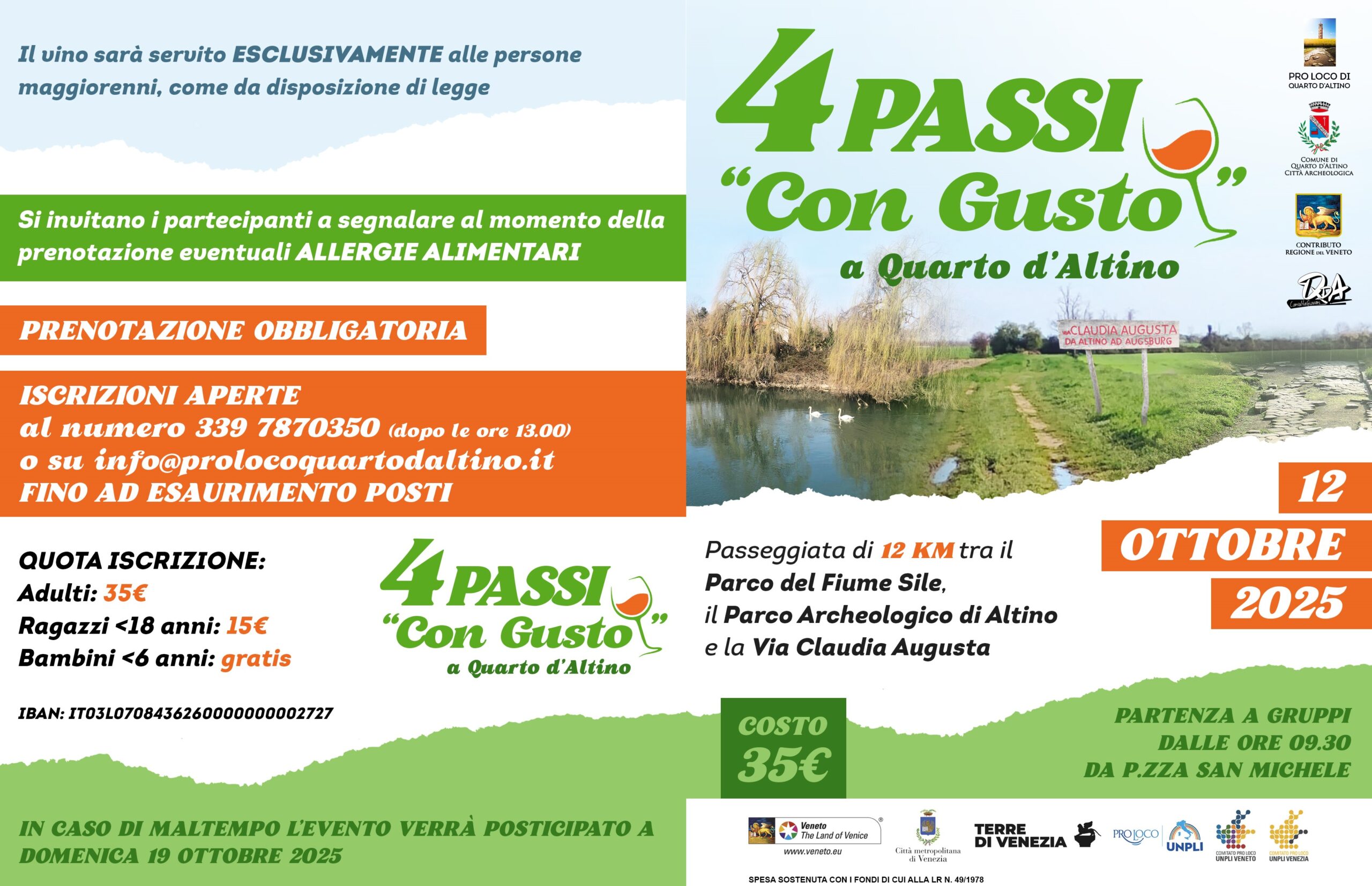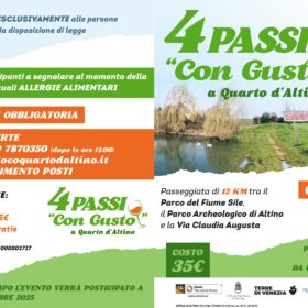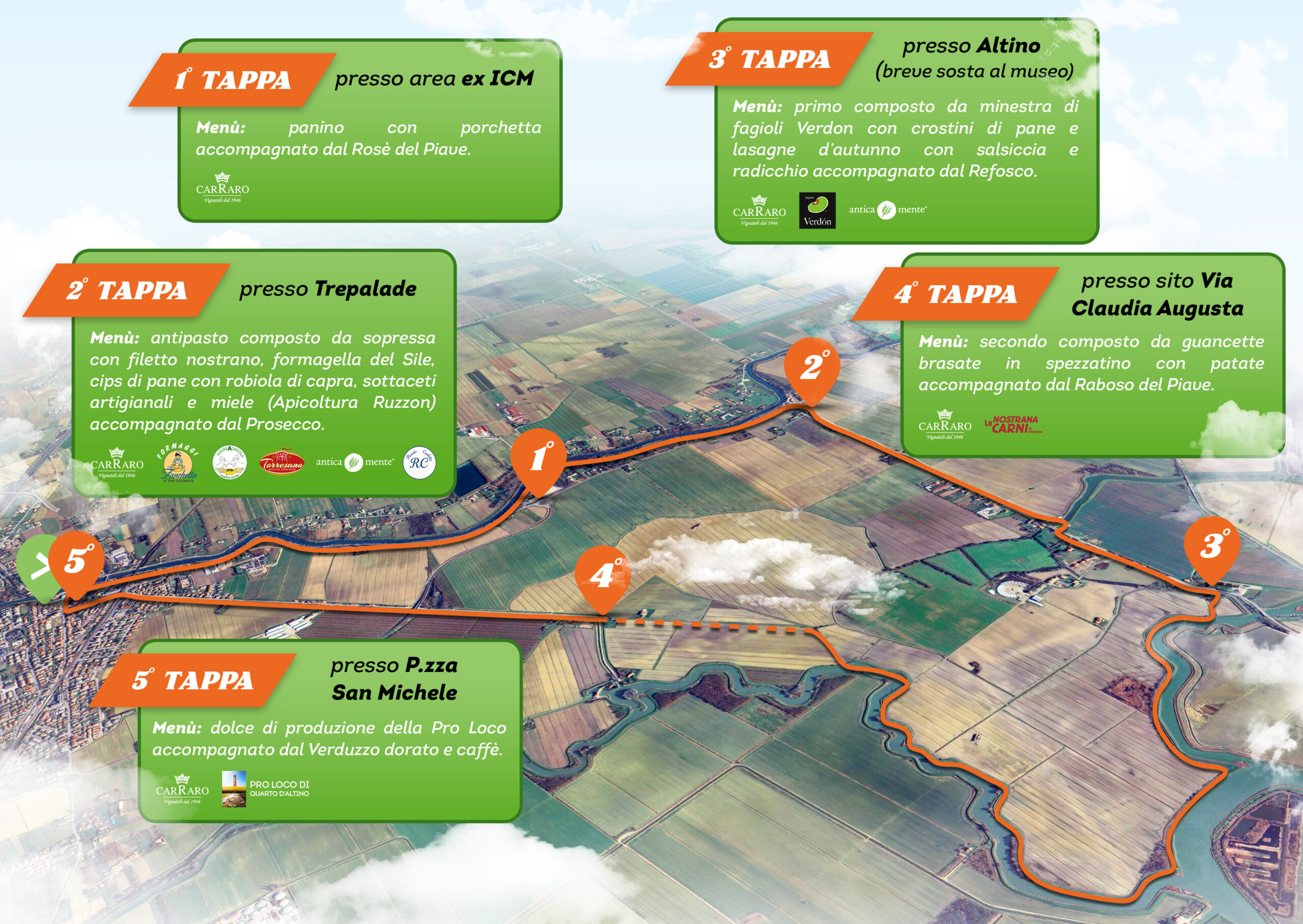 Partenza da Piazza San Michele alle ore 09:30 e cinque tappe lungo il percorso che si snoda tra il Parco del fiume Sile, Trepalade, Altino, e la Via Claudia Augusta con arrivo in Piazza San Michele: un vero e proprio viaggio tra sapori e tradizioni!