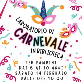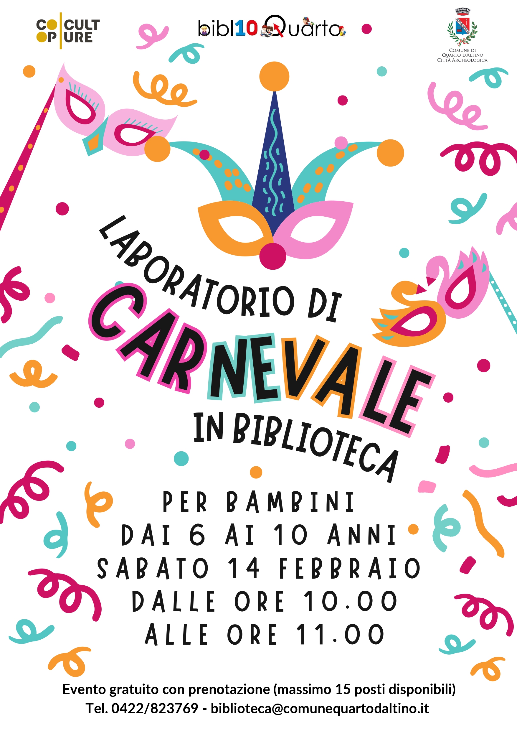 Laboratorio di carnevale per bambini dai 6 ai 10 anni in biblioteca; evento gratuito su prenotazione, massimo 15 bambini; per le prenotazioni contattare la biblioteca 0422 823769 oppure email biblioteca@comunequartodaltino.it