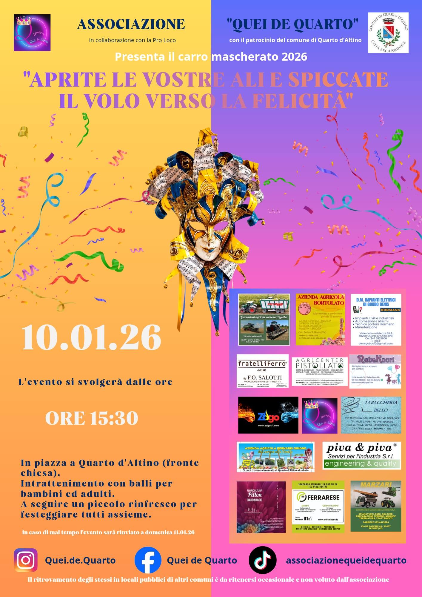 L'Associazione "Quei de Quarto", in collaborazione con il comune di Quarto d'Altino e la Pro Loco, inaugura sabato 10 gennaio in Piazza San Michele il carro allegorico allestito per il Carnevale 2026.