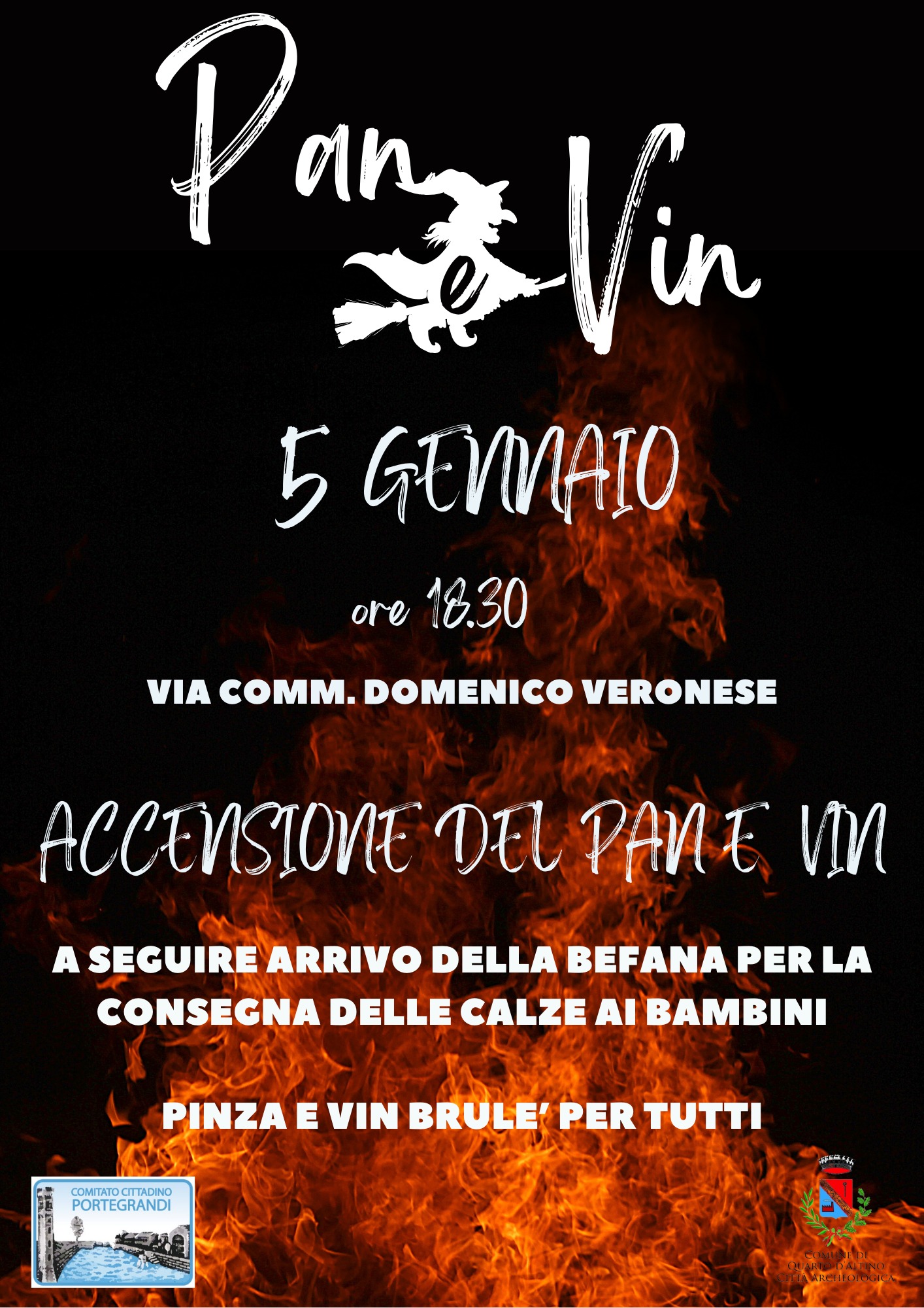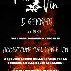 Accensione del Panevin alle ore 18:30 in Via Comm. Domenico Veronese con arrivo della Befana per i bambini e tanta pinza e vin brulè per tutti. Evento organizzato dal Comitato Cittadino di Portegrandi.