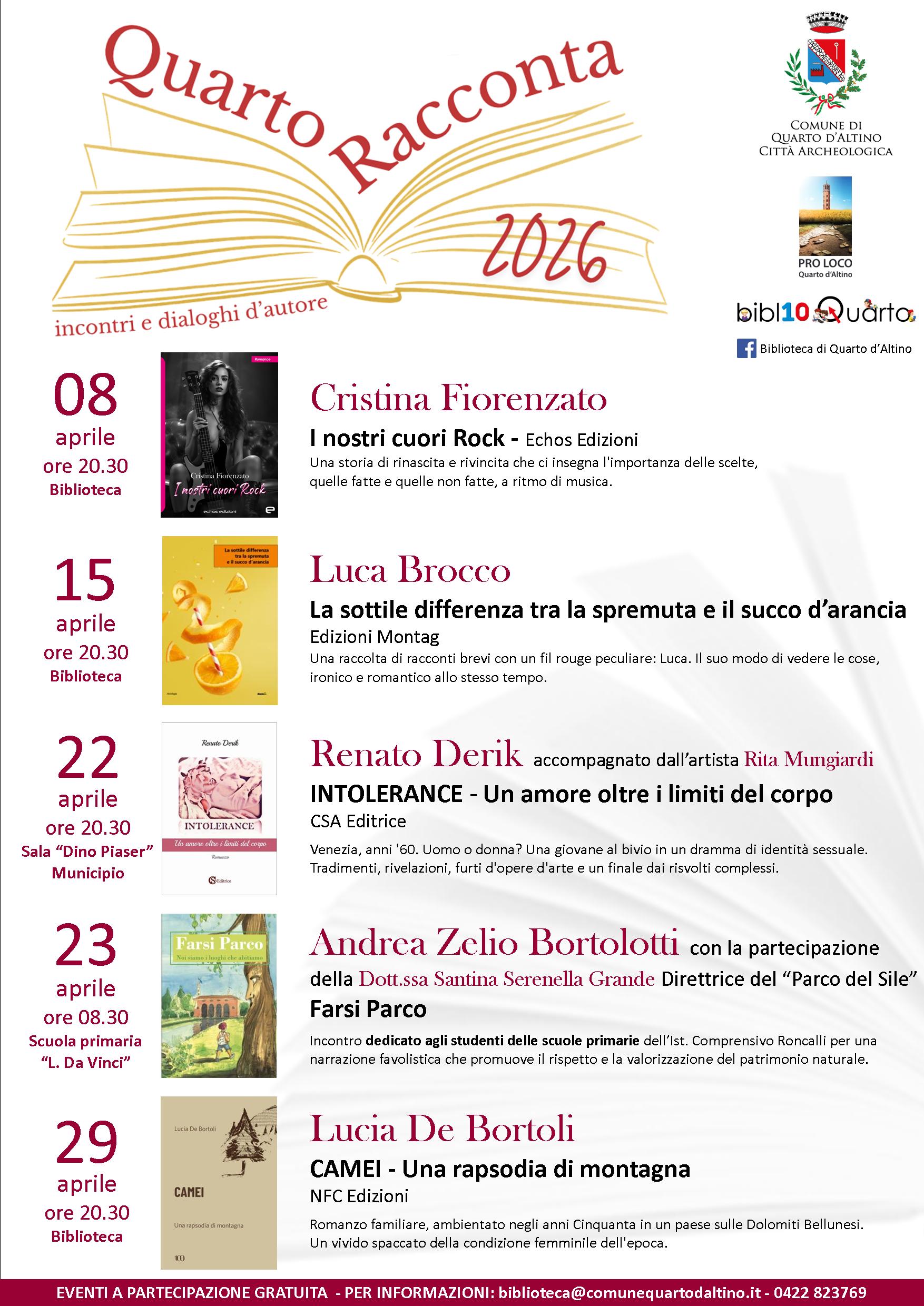 "Quarto Racconta", rassegna letteraria annuale organizzata dal Comune di Quarto d'Altino e la sua biblioteca per promuovere la lettura e le opere degli scrittori locali ed esordienti.