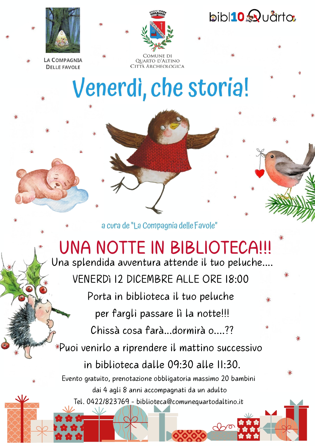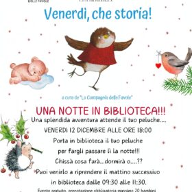Appuntamento speciale in biblioteca con le letture animate per i bambini dai 4 agli 8 anni a cura della Compagnia delle Favole...ricordatevi di portare il vostro peluche! Ascolterà con voi le letture e poi passerà lì la notte. Lo potrete ritirare il sabato mattina dalle ore 09:30 alle 11:30.